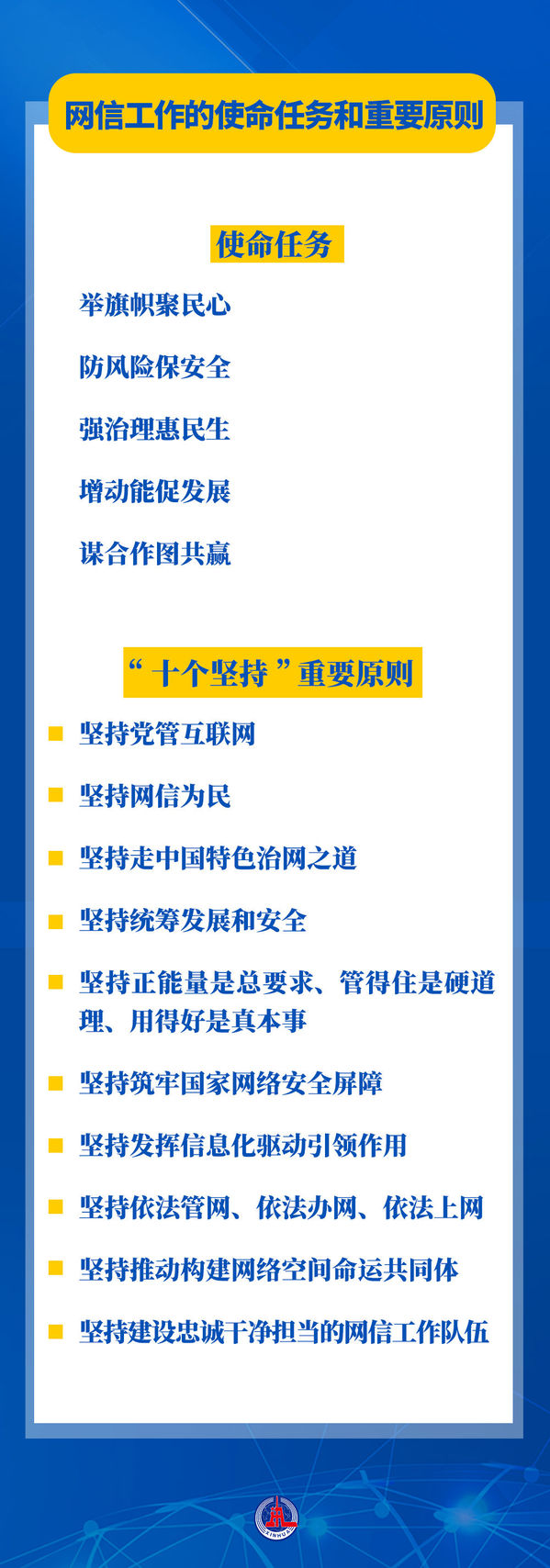 习近平总书记鲜明提出的网信工作“5个方面、30个字”的使命任务,涵盖互联网内容建设、网络安全、网络惠民、信息化建设、国际网络空间治理等,“十个坚持”重要原则进一步丰富和发展了习近平总书记关于网络强国的重要思想,把党对网信工作的规律性认识提升到全新高度。总书记提出的使命任务和重要原则,具有很强的政治性、战略性、指导性,既着眼当前,又谋深虑远,为做好新时代新征程网信工作指明了前进方向,为推进实现网络强国提供了根本遵循。