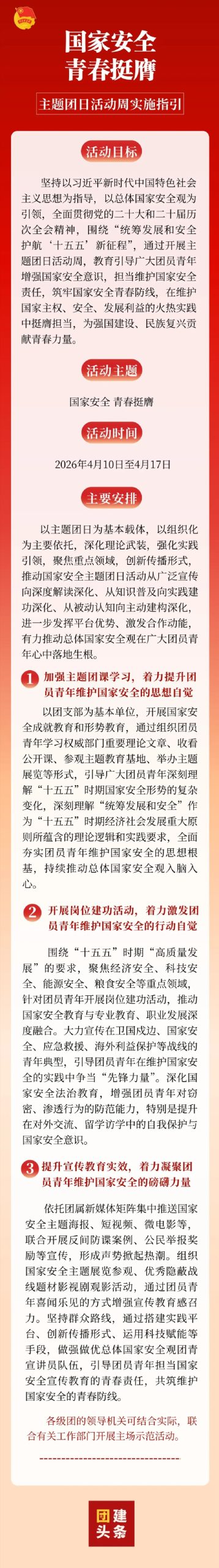 2026年是“十五五”规划的开局之年。为深入贯彻落实党的二十届四中全会精神,动员广大青年在护航“十五五”新征程中挺膺担当,在第十一个全民国家安全教育日来临之际,现就开展国家安全主题团日活动周提出实施指引如下。